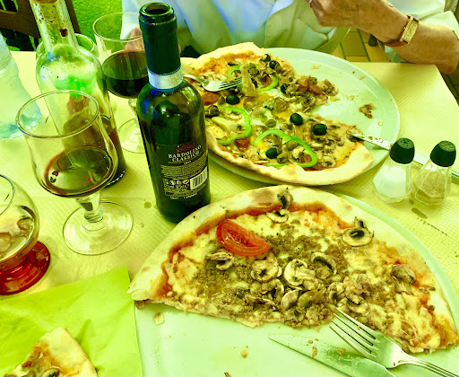 Very affordable but good, tasty, european/italian style pizzas (if you tasted Domino pzza, Pizza Hut, etc in North America you’d know what i mean- the crust’s just not the same). Free-flowing spiced olive oil. Decent wine- we had imported, origine-brand- controlled Bardolino- just regular italian but strong enough to go along with our pizzas, Campione and house-named Casa Mona. Friendly owner/staff. Quiet area, parking in street available. Open Sunday (most businesses around arleady...