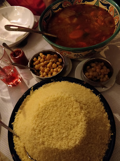 Couscous moyen et sans saveur Tajines correct Merguez pas assez cuite et poulet trop sec Une seul assiette de semoule à faire passer sur la table de bout en bout (table de 8) idem pour le bouillon. Nous avons fait la remarque et le serveur nous a sèchement répondu que cela était normal parce que nous n'étions que 5 (sur 8!) A prendre couscous Ailleurs on nous aurais servi deux assiettes de semoule et bouillon (une de chaque côté de la table) ou conseillé de nous regrouper par plat ( à la limite pourquoi pas) dans ce restaurant ... rien . Débrouillez vous. Très déçu de l'acceuil et du repas dans sa globalité Point positif Restaurant propre et semble entretenu Points négatifs Un seul serveur (jeudi soir en semaine) la salle était malgre tout presque au complet (tout les gouts sont dans la nature). Le serveur semblait débordé cela explique peut être son accueil froid ses remarques trop familières à mon goût et les temps d'attente qui nous ont paru très long (ressenti) Nous avons nos habitudes ailleurs et la comparaison était forcément à l'ordre du jour. Nous ne reviendrons pas. Vous trouverez largement meilleurs ailleurs à des prix similaire. Stationnement difficile dans la rue. Conseil: demander à goûter le cocktail maison avant de commander. Je n'ai pas pu le boire. (Question de gout) Aller... sans rancunes on ne se reverra pas de...