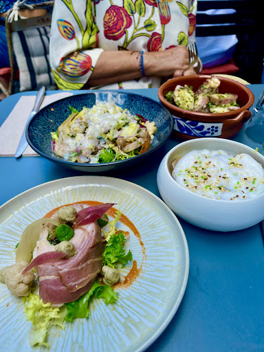 Côté nourriture le prix des assiettes est très élevé pour des quantités réduites mais surtout une absence totale de saveur. On avait l'impression que les cuisiniers avaient oublié l'existence des épices et herbes aromatiques. Les bulots étaient durs, le crespeou ressemblait à un flan aqueux comprenant des légumes cuits sans aromates, le tataki de thon avait peu de goût et les haricots l'accompagnant étaient noyés sous l'huile de sésame. Le pain d'accompagnement avait tout d'une baguette fade trouvable dans n'importe quelle boulangerie de quartier peu soigneuse. Pour finir nous avons eu le droit à une des pires panna cotta de notre vie, en-dessous de ce que l'on trouve en grande distribution. Elle n'avait pas la consistance d'une panna cotta (très liquide), elle était beaucoup trop sucrée et le goût de violette était sans aucun doute apporté par un sirop industriel et non pas par une infusion
