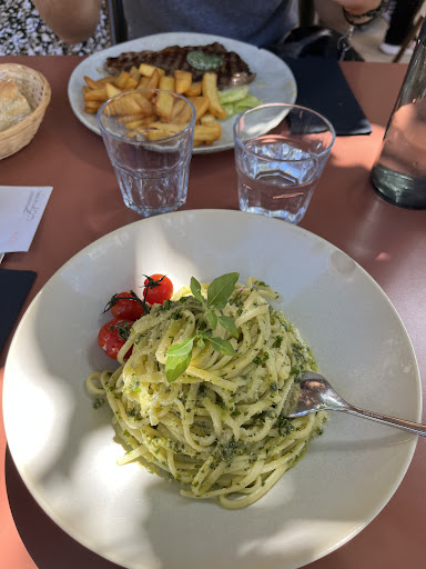 Good traditional French food with a few twists, in a pretty enclosed garden near the castle. We shared a courgette beignets starter (fried in batter) with rocket salad and mustard vinaigrette. Then we had a wild mushroom risotto, pavé de thon, a local beef gardiane (bourgignon style stew) and pastilla d'agneau (lamb in a thin flaky pastry), all wonderful. Followed by sharing a blueberry and cream tartelette. Friendly...
