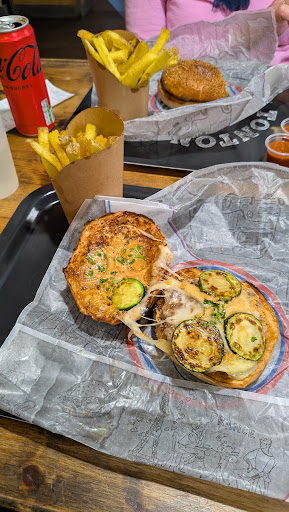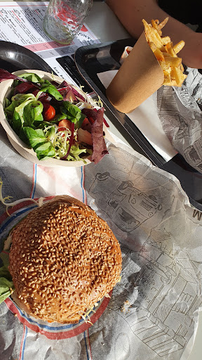 Read moreIn visita ad Arles, sono stata in questo locale per una cena veloce che fosse gradita dai miei bambini, in assenza di un mcdonald's. Abbiamo ordinato 2 menu basic (hamburger e patatine) e 2 più grandi (hamburger, patatine e dessert) e una lattina di coca cola, per 67 euro totali. Tre degli hamburger erano quelli più semplici del menu, mentre quello di mio marito era di carne di toro. I prodotti sono cucinati al momento, il gusto è gradevole, la carne tenera e il dessert monoporzione è stato letteralmente divorato dai miei figli (specie la mousse al cioccolato). Quella che è un po' mancata, a mio avviso, è stata l'attenzione verso il cliente: le patatine vengono servite in piccoli conetti di cartone che poggiano in piedi sui vassoi e mia figlia, appena alzato il suo vassoio dal bancone per portarlo al tavolo, le ha inevitabilmente rovesciate tutte in terra e io, che mi sono mossa di conseguenza per aiutarla, ho fatto altrettanto con le mie. I proprietari, attenti, si sono mossi subito per pulire il pavimento e il bancone; tuttavia sinceramente avrei apprezzato il gesto di dire: vi riempio un nuovo cartoccio, visto che non siete riuscite neanche a raggiungere...