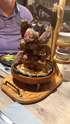 Decided on the flaming steak tower (see photo) between 3 of us- came with a small salad cheese potatoes and we ordered an extra bowl of fries.