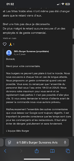 Je dénigre sans fondement ? Je paye pour un service ce n’est pas gratuit que je sache et Je donne un avis qui est fonder sur ma commande que j’ai effectuer auprès de votre restaurant. LOL qu’est ce qui est infondé la dedans ? D’avoir attendu 1h une commande « Un burger et des Wings.