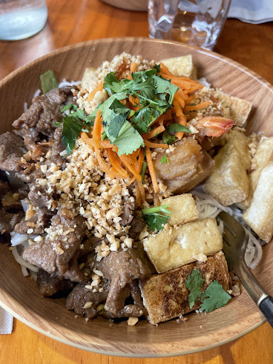 4 crevettes se battaient entre elles dans mon bol. Aucun assaisonnement comme annoncé (citronnelle) le seul goût était un arrière goût ce qui me permet d'affirmer qu'il ne s'agit pas de crevettes fraîches mais congelés... Trop, beaucoup trop de nouilles surtout en comparaison des crudités. 4 brins de coriandre, ce qui relevait davantage le manque de saveur et les cacahuetes étaient tellement émiettés que cela semblait plus à de la poussière, donc là aussi aucun goût à ce niveau là. Pour couronner le tout, je n'ai pas retrouvé un mais deux cheveux dans mon bol.. et oui, vous avez bien lu. Bref, autant vous dire que je n'ai pas continué de manger. Les prix restent abordables mais en même temps au vu de la "qualité" ça se vaut.. quoi que j'ai déjà connu meilleur bobun et pour un prix inférieur à Montgallet (je vous laisse découvrir mes autres avis si cela vous intéresse). En somme, je ne recommande pas...