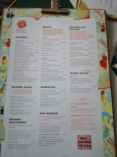 We ordered the Pot-Ô-Phó (€18.90) and the Giant Banh‑Mi (€18.90). The menu says rice noodles, thinly sliced beef, pickled carrots/red onion, and spiced broth for the Pot-Ô-Phó, and crispy chicken, Maggi mayo, pickled carrot & cucumber, lettuce, and cilantro for the Banh‑Mi.