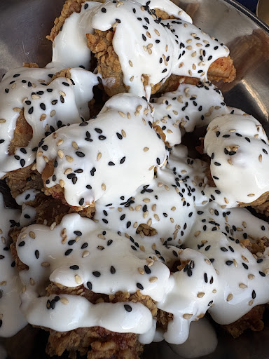 In a nice street there is a little restaurant with nice blue chairs and a table outside where we’ve enjoyed the best Fried chicken. Mandu, and the choose your own bowl is great. I chose one with rice, bulgogi, raddish, mushrooms, kimchi but you can have a vegan, vegetarian or also with that great fried chicken again option. I liked the place because there is a small menu but with only good food and drinks. Nice Korean mocktails, cocktails and beers. And my son had the best matcha cheesecake. Quality is very hight for what you get (big portions).it is a welcoming place and after a long travel day, for us this was the best comfort food...