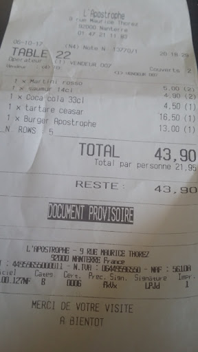 Read moreTout d'abord, je tiens à dire que je fréquente L'Apostrophe depuis plus de 10 ans avec ma femme, et le service ainsi que la qualité des plats ont toujours été excellents. Malheureusement, ma femme est décédée récemment, et hier, j'ai assisté à ses funérailles, peu de temps après mon anniversaire. Elle avait même préparé des cadeaux pour moi…