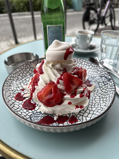 En photo, un pavlova cœur glacé aux fraises et une terrasse extérieur en zone piétonne entourée de végétation aux abords de la voie menant à La Défense.