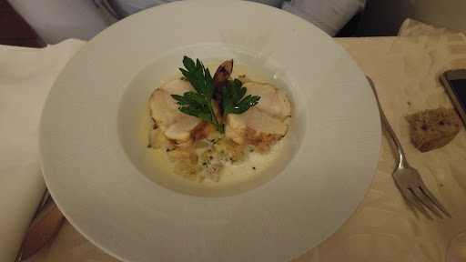 Nous avons tous les 2 pris le menu entrée, plat et dessert pour 49€ (rapport qualité/prix excellent !) avec un supplément pour certains plats mais cela en valait la peine. Entrées : Langoustines rôties sur lit d'épeautre, basilic thaï (la mienne) et Tartare de thon, citron vert (pour mon compagnon). Plats : Tournedos Rossini, galette de pommes de terre et truffe Mélanosporum. Pour mon compagnon : Lotte à la plancha, émulsion de langoustines (de mémoire pour l'émulsion donc à vérifier). Desserts : Le Royal de litchi framboisé et son sorbet. Pour lui : Cheese cake, nectar de griottes, spéculoos et sauce chocolat blanc. Tout était parfait,...