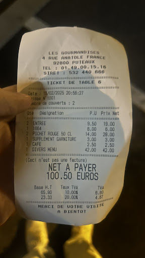 Read moreAccueil avec des regards étonnés. Il fait froid à l’intérieur (un autre client s’en est plaint en plus de moi). On ne nous présente pas le plat du jour (des coquilles Saint Jacques) mais on le présente aux autres clients. Le pain est DISTRIBUÉ à l’unité comme si on était dans une cantine militaire (pas de corbeille, il faut demander pour avoir son bout de pain). Nous commandons un pichet de rosé et on reçoit un pichet de rouge. Les accompagnements ne sont pas écrits sur la carte. Réservation par The Fork avec -20% sur tout sauf boissons et menus, mais une fois la note en main, les entrées sont comptées entièrement et le supplément garniture aussi. De plus, sur les plats nous n’avons eu que -5%. Ci-joint la note, le menu et la réduction The Fork pour...