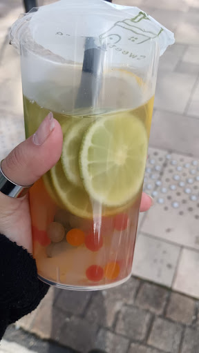 Un bubble tea tiède ( frais normalement ), sans tapioca mais avec d'autres trucs à l'intérieur ( je ne sais toujours pas ce que c'est) et avec 3-4 boba que je n'avais pas commandé. La boisson était extrêmement sucrée et il n'y avait pas un seul goût de citron... Alors que j'ai quand même pris au deux citrons. En y repensant, je pense qu'il y avait du litchi en guise de tapioca... Je suis un peu allergique au litchi....