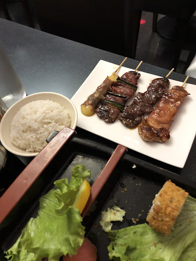 Sushi, meat skewers & spring rolls presented in an informal restaurant with a bar.