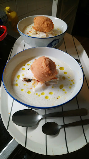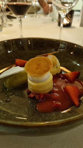 -le service un peu trop prĂ©sent/envahissant / des doutes sur leurs connaissances culinaires : tu ne peux pas te servir de verre d'eau on t'arrache la carafe des mains pour le faire Ă ta place... La prononciation de certains ingrĂ©dients (poivre de sichuan prononcĂ© "seche-au-vent" ou foccacia "foca-chia") ce qui est un peu dĂ©cevant quand on prĂ©tend Ă deux Ă©toiles -l'attente de 10 Ă 15 minutes entre chaque "plats", combinĂ© au quantitĂ© vraiment miniature dans l'assiette : tu te bourres de pain pour te caler entre deux cuillĂšres Ă thĂ© de poisson. Pas un plat ne fait plus de deux bouchĂ©es (bon comme la plupart des plats sont ratĂ©s... au final tant mieux) -"Les pĂ©tales de cabillaud sur une fine ratatouille au basilic, lait de morue et sorbet dâun gaspacho" C'est le premier plat du menu dĂ©gustation et le meilleur, les saveurs sont simples (les legumes du gaspacho et de la ratatouille Ă©tant trĂšs proches) bien rehaussĂ© en basilic. Je regrette seulement que le plat soit servis entiĂšrement froid, un ratatouille chaude, un lait tiĂšde et une boule de sorbet fonctionne bien mieux (j'ai eu le temps de refaire cette semaine, ce n'est pas bien compliquĂ©... photo pour preuve avec une portion nettement plus consĂ©quente). -"La daurade SĂ©baste et pĂątes Ă lâencre, Bouillon de tĂȘtes aux Ă©pices Kimchi, fleur de courgette et olives de Kalamata" *"La daurade SĂ©baste et pĂątes Ă lâencre" pĂąte au singulier il y a une et une seule tagliatelle dans l'assiette *"Bouillon de tĂȘtes aux Ă©pices Kimchi" sauf que dans ce restaurant on n'a aucune idĂ©e de ce qu'est le Kimchi, donc on a juste utilisĂ© le piment doux qui sert Ă sa confection (dont le gout se situe Ă mi chemin entre le paprika et le piment dâEspelette, soit rien de trĂšs spĂ©cifique car le gout du kimchi se dĂ©veloppe uniquement lors de la fermentation) pour rĂ©aliser un bouillon Ă la sĂ©toise (dis par le serveur, et confirmĂ© le cuisinier) alors que le nom du plat promet forcĂ©ment des saveurs corĂ©ennes... quand on parle de bouillon au kimchi on pense forcĂ©ment au "Kimchi jjigae" plat emblĂ©matique de la CorĂ©e mais qui de toute Ă©vidence n'a jamais Ă©tĂ© goutĂ© par le cuisiner, car ici on sent bien plus le cotĂ© reste de poisson bouillie qu'autre chose. Une mention spĂ©ciale pour la "daurade sĂ©baste" poisson qui a le gout et la texture de l'eau, c'est Ă dire aucun. nous avons renvoyĂ© les assiettes mĂȘme pas terminĂ© avec un "Infame" et pourtant c'est vraiment rare que je trouve quelque chose d'immangeable -le cuisinier nous a renvoyĂ© un autre plat de poisson en remplacement du prĂ©cĂ©dent "LĂ©gine cuite lentement, veloutĂ© de petits pois et encornets aux poivrons confits,Mousse lĂ©gĂšre de faisselle & vinaigrette agrume" Le poisson est meilleur que la daurade, le veloutĂ© de petit pois est bon, mais comme le poisson est nappĂ© de confit d'orange (trop) sucrĂ© ça ne se marie pas mais alors pas du tout avec les petits pois -"Le suprĂȘme de pintade du Gers et sabayon aigre doux, Cerises et oignons rouges, jus de ses pillons au satĂ©" La fond de sauce de ce plat nous a instantanĂ©ment Ă©voquĂ© les fonds de sauces de cantines... Encore une fois "Cerises" dans le titre est abusif car il y a une seule cerise coupĂ©e en deux. La sauce n'Ă©voque absolument rien du satĂ© (sauce a base de cacahuette et lait de coco Ă©picĂ©s) mais beaucoup plus un fond de veau instantanĂ© & trop sucrĂ© Ă en devenir Ă©cĆurant dĂ©s la premiĂšre bouchĂ©e. -Les fraises confites, c'Ă©tait pas mal mais rien de transcendant.