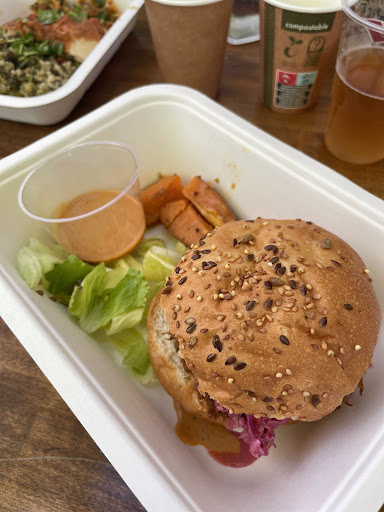 Pour ma part, j'ai choisi le burger au porc et aux patates douces, tandis que ma compagne de table a opté pour le poulet aux lentilles épicées. Deux plats parfaits pour un déjeuner rapide entre deux spectacles.