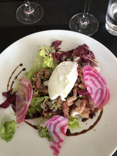 La salle est moderne, décoration minimaliste de bon gout. Présentation des menus et de la carte des vins. Nous choisissons un menu à 24 €, Entré : émincé de Saumon, plat : Bar en croute de sel et un menu à 34€ entré :Demoiselles d’eau douce, Plat : croustillant de veau . A la commande nous sommes informé qu’il n’y a pas de Bar et qu’en remplacement il y a du Saumon… Très déçus, car poisson saumon et saumon… nous marquons notre désappointement… Les entrées : Emincé de Saumon, petite salade de mesclun, ananas avec grenade et carrés de saumon à peine cuit, servi sur une ardoise, très bon. Demoiselles d’eau douce (écrevisses) avec escargots, purée de châtaignes, farineux et pas de gout !
