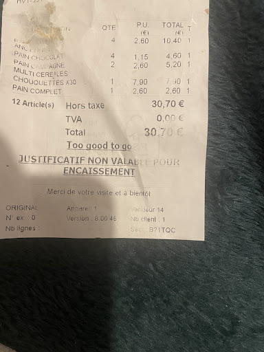 Je suis venu chercher un panier Too Good To Go, tout ce que je peux vous dire c'est : A FUIR. Je rappelle le concept : brader sous forme d'un panier les invendus du JOUR. Marie Blachère (en tout cas celui d'Autun) a réussi à réinventer le concept : Si vous ne vendez pas vos produits, vous les brader le lendemain, si vous ne les vendez pas le lendemain vous les refilez en panier Too Good To Go le lendemain soir. J'ai payé 9e avec la promesse de belles viennoiseries, de tartes indiqués en description et affichant une magnifique photo de tarte bien fraiche, le tout pour soit disant 27e de produits que je ne donnerais même pas à mon pire ennemi, ce panier se compose de : -4 pains au chocolats de la veille (je rappelle que nous sommes le lendemain soir) donc clairement rassis -30 chouquettes banales de la veille et ça se ressent -4 pains aux céréales et 2 pains campagnes que je ne donnerais même pas à manger aux canards tellement ils sont dures. Malheureusement je n'élève pas des cochons, les pains ont dû finir à l'endroit où ce type de produit doit aller : la poubelle.
