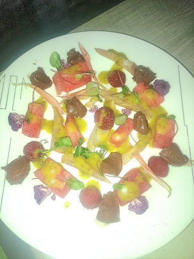 ENTRĂES Madame : "PastĂšque, bar fumĂ©, crĂšme chocolat huile d'olive et fleur de sel"