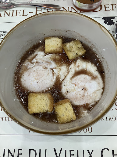 Read moreLovely meal here on a Tuesday evening, no reservation needed. Parked in some on street parking nearby that is free after 19:00. Friendly helpful staff, good selection, alcohol free cocktails available. We had the onion soup and oeufs merguette to start, then caramelised pork and fish of the day (salmon) both with chips for main course, followed by crème brûlée and coffee and hot chocolate. Good value and good portions. Highly...