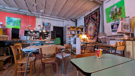 Cet ancien garage a été rénové avec goût et style. Il garde le côté industriel tout en étant chaleureux grâce aux décorations et objets qui peuvent être achetés pour beaucoup d'entre eux. Le mobilier en formica pour se restaurer vous replongera dans vos souvenirs d'enfance, tout comme la vaisselle pour le service et le coin vinyle pour les amateurs du "vrai" son. C'est suranné mais avec beaucoup de goût encore une fois.