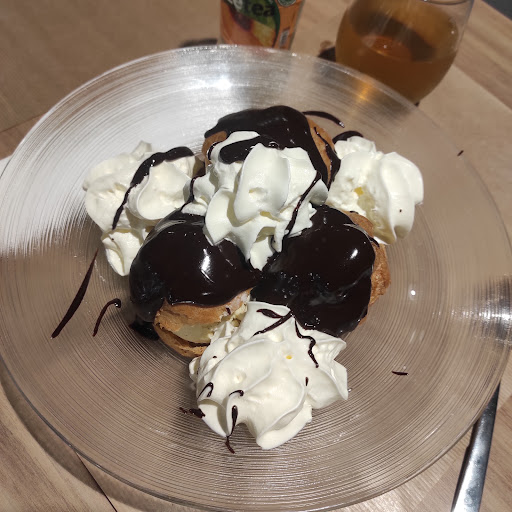 Nouveau chef cuisinier qui commençait le jour de notre venue. Arrivé un peu avant 19h, à 20h15 nous étions en train de se dépêcher pour finir notre plat car attendu à 20h30 au théâtre, heureusement juste en face.... Nous avions pris une formule : entrée, plat, dessert donc nous sommes revenus prendre le dessert après le théâtre. La commande des desserts avaient été prises avant de partir. En revenant, les desserts n étaient pas prêts mais surtout pas disponible. Il en restait un sur les 3, nous avons dû prendre autre chose : profiteroles. Ces dernières étaient très appétissantes à première vue mais les choux étaient durs et secs.... une assiette très bien garni mais la qualité n y était pas...dommage... Service long, oublié d envoie de notre commande de plat en cuisine, rien d exceptionnel en cuisine mais très correct en quantité, par contre 1des 3 plats était trop cuit : brochette trop sèche... A refaire, plus tard, une fois que le chef aura pris en main sa cuisine.... Le personnel en salle y est sympa et à fait tout son possible pour que nous puissions passer un bon moment. Les prix sont corrects. Il manque un petit fond musical car ambiance assez monotone et froide... nous avons tout de même bien rigolées et appréciées cette soirée. A refaire plus tard, pour avoir...