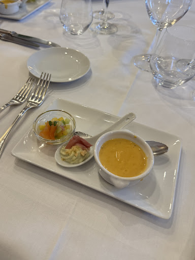 Read moreSalle vieille avec déco sans queue ni tête sauf si vous aimez les canards !!!. Je n'ai pris que le menu à 28€........ Cuisine moyenne, trop salée ou trop sucrée mais servie sous cloche avec des couverts en argent pour tenter de cacher les défauts ! On sent que le cuisinier a du potentiel mais ne l'exploite pas. Cher pour ce que l'on a. Attendez vous à avoir faim en sortant. C'est pour cela que l'on vous donne beaucoup de pain ! Si vous ne buvez pas de vin, n'attendez pas à ce que l'on vous propose autre chose mais payez le quand même. Personnel très austère qui n'a pas appris à sourire. Bref, on mange beaucoup mieux avec une meilleure ambiance dans des adresses beaucoup moins chères et dans la région, il y en a ! L'adjectif gastronomique associé à cette enseigne me fait bien bien rire. A oublier...