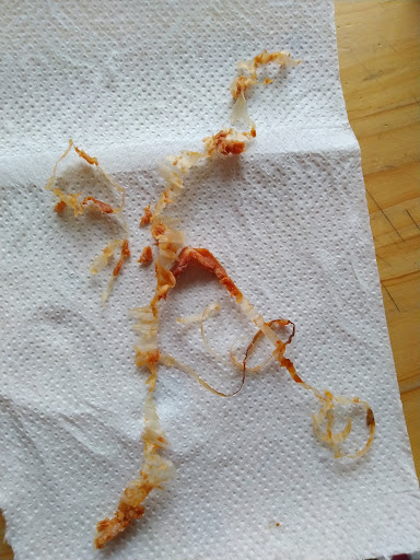 Nous avons commandé une pizza Chef hier soir, ainsi qu'une trois fromage et un tiramisu. Livraison correcte, assez rapide. Malheureusement, j'ai remarqué à la première bouchée de la pizza Chef, contenant du chorizo, que la peau (plastique, ou vraie peau ?? : Photo dispo avec cet avis), était laissée sur les rondelles de chorizo. Cette peau n'est pas consommable. J'ai donc un morceau de peau d'environ 10 cm de long qui était resté coincé dans ma gorge ! Et cette peau était présente sur toutes les rondelles de chorizo. Cette pizza était donc bien difficile à manger, car il fallait scruter chaque rondelle de chorizo pour en retirer la peau. Je ne trouve pas ça normal du tout !