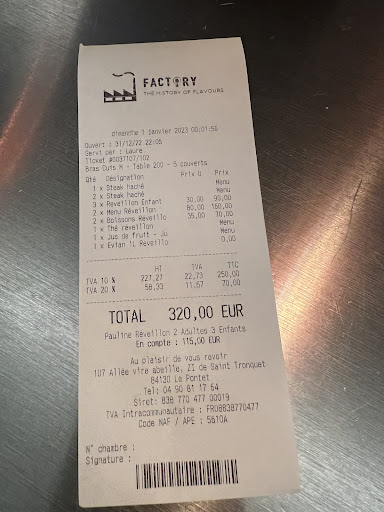 31 décembre 2022 Nous sommes 5 , 2 adultes et 3 enfants Pour faire simple : les 3 menus enfants 30€ par enfant sont bons ( frites très bonnes / steak haché « classique « ) ( leur dessert très bons ) Les 2 menus adultes : entrée : les Burgers au foie gras sont infâmes : pain Burger pas bon , foie gras étalé vulgairement et sans goût , enfin si : un goût tout sauf de foie gras ! Brouillade a la truffe noir écœurant et saumon acceptable . Arrive l’entrée chaude : saint Jacques : caoutchouc… et le meilleur arrive ( ironie bien évidemment) : les médaillons de veau absolument sans goût et froid ( on me propose d’y faire réchauffer , j’accepte mais c’est encore plus mauvais le veau est dur comme du bois et je mange du plastique) quant au fagot de haricot … c’est … j’ai pas de mot pour rester poli …. C’est une honte . Bref , nous sommes partis pour éviter tout débordement et pour éviter de saborder l’ambiance du 31 . Une chose est sure , votre menu est une arnaque . Point positif : le pain est bon ! Et les serveuses serveurs très souriant pro et courtois . Laure est très conciliante et professionnelle . Un constat simple pour le patron : achetez des produits de meilleurs qualités car la c’est tout sauf acceptable … c est à ce demander si c’est des Cuisiniers qui ont fait les plats ou si c’est du tout prêt tout fait industrielle et que vos micro ondes ont fait le reste . Quant au 2 hommes derrière le comptoir a boisson habillé en noir … à part rester les bras croisé et à parler j’ai pas vu bcp de travail de fait en 2h45 … Déception totale : on ne reviendra plus . ARNAQUE Une...