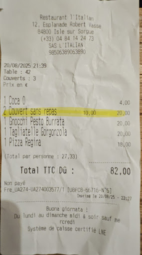 Read moreRestaurant à éviter si vous cherchez un endroit où bien déjeuner…Nous sommes venus hier dimanche 1er juin pensant tomber sur un bon resto, on ne cherchait pourtant pas la grande cuisine, le seul point positif est le service des jeunes… Nos voisins de table des hollandais avaient commandés lui un plat de lasagnes et elle des pâtes…les lasagnes étaient du réchauffé au moins plus d’une fois vu la couleur… et elle ses pâtes parlons en…. Quand à nous pour avoir payer près de 45 € pour une salade italienne où il y avait plus de salade qui cachait une ou deux rondelles de tomates plus quelques ingrédients tout cela qui baignait dans une pseudo vinaigrette et moi qui me faisait une joie de manger des tagliatelles bolognaise… il n’y avait que le nom…la sauce sortie des pots que l’on achète au supermarché et encore sans marque et pour un prix de 21,00€ Touristes, fin gourmets et autres qui voulaient vous faire plaisir dans un bon resto à l’idole sur sorgue alors fuyez ce restaurant et garder votre CB au chaud dans votre poche Une honte , c’est clair un touriste ne repassera pas Fuyez c’est de...