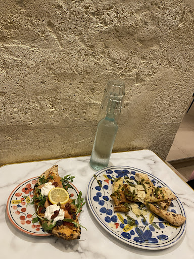Les assiettes, colorées comme des céramiques artisanales italiennes complètent à merveille l’ambiance, un vrai petit air de trattoria typique, mais revisité façon moderne, pour l’ambiance de la salle entre chaises roses, briques apparentes, guirlandes lumineuses et portraits rétro, on navigue entre cinéma italien et déco Pinterest. Résultat ça claque visuellement et ça marque.