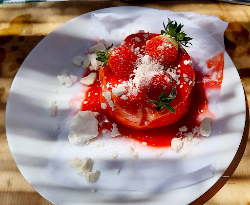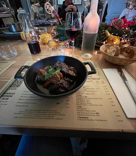 Category: Bistro. Having a free night during a culinary tour based in this great little town, we found this warm spot online and our host confirmed it as a good choice. When we arrived, we learned that the restaurant offers two experiences, a more gastronomic prix fix and a more casual bistro. Comparing menus, which change with the wind, it was a tough choice, but we chose the heavy, rustic wooden communal table in the bistro. The decor was a funky blend of colorful dried squash, hairy chestnuts, and a Carole Channing statue, and a statue of a chef watching over the dining room from a high corner. Although we didn’t expect any of the staff to speak English, our server did and she was very helpful. The menu was small but well-curated, as was the wine list: only a few local reds, all of which were delightfully inexpensive (we don’t like to spend very much money on restaurant wines). We started with the L’oeuf Mayo (kind of like deviled eggs), which we learned are a Big Deal in France, with many chefs competing to have their eggs selected as the National champion. This chef won second place 🥈but I would have voted his eggs number 1. Unlike common deviled eggs in the U.S., the yolk, which was cooked to a little more than “perfect” (65C, though Chefs fight over this), was intact in the halved egg 🥚. This chef’s particular mayonnaisey mustardy mixture was then spooned on top. Excellent. I’ll be doing a lesson on my version, which I have not invented yet. For our mains Sarah chose the steamed cod with vegetables, which was beautiful, aromatic, and delicious. I was torn between the trotters sausage and the seared tuna with Avo and cherry tomatoes. I chose the latter and much enjoyed it, but later coveted the aroma of the trotters wafting from the bowl of the guy to our right. We finished with an excellent Creme Caramel. Incidentally, the restaurant’s name derives from a sprawling garden outside the two restaurant buildings. Although it was dark and too cool to dine outside, the garden looked like it would be a fantastic place to spend a warm afternoon or evening. YouTube’s...
