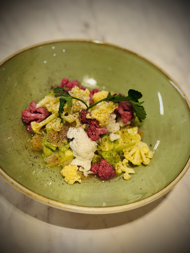 The Tartare de saumon gravlax with avocado and pickled cauliflower was beautifully presented but unfortunately lacked flavor. The salmon was served too cold, not at room temperature, and I had to season it myself with salt and pepper, which was a bit disappointing.