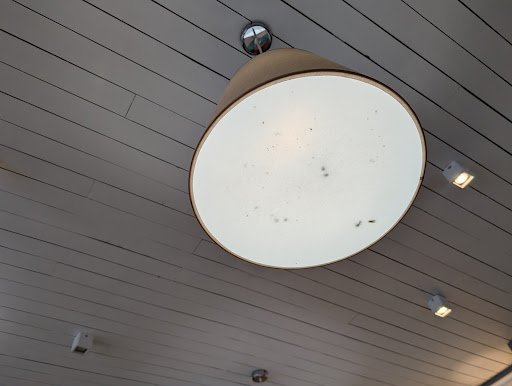 En photo, la lampe avec les insectes qui a trôné au-dessus de nos têtes tout le repas, des crêpes au contenu famélique (3 pétoncles pour 15€50) et présentation insipide (ingrédients juste posés sur la crêpe), des crêpes sucrées épaisses comme jamais (qui raviront peut être certains mais pas nous !).
