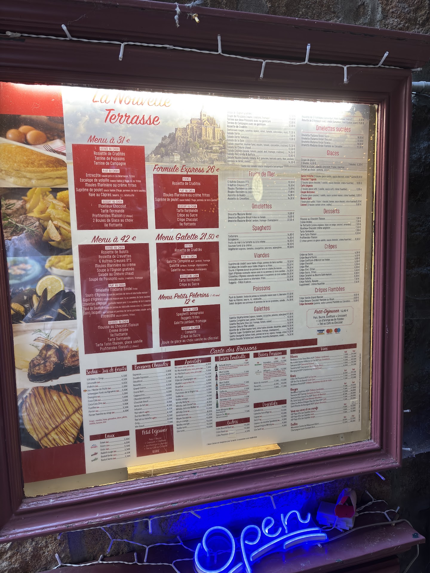 Value for Money One of the most pleasant surprises was the pricing. Compared to other restaurants on Mont-Saint-Michel (which are often overpriced), La Nouvelle Terrasse offers relatively cheap meals. For two main dishes and drinks, we paid under âŹ40 â quite reasonable given the location. Itâs not the cheapest in France, of course, but for a UNESCO World Heritage Site, it felt fair.