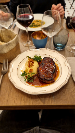 La suite du service est inégal selon les personnels. Seul un serveur, le plus âgé, est sympathique. La serveuse, est du genre méprisant et hautain. Assignée au bar, elle prépare l'américano à l'arrachée - tout l'alcool est dans le fond - et sert le verre de vin très très court sans même le faire goûter... Quant à son jeune collègue, s'il affiche un sourire il n'en est pas moins de mauvaise foi. Ils ne nous alerte pas sur le choix de l'entrée qui est une redite de l'assiette à partager que nous prenons avec les apéritifs. Nous avons donc mangé deux fois la même chose au cours du même repas. A l'arrivée de l'entrée mon avis était fait. A une remarque sur la cuisson - ou sur une attente un peu longue entre les entrées et les plats - qui a rendu sèche une une viande qui aurait du être tendre, il insiste pour affirmer que le morceau, "un quasi de veau de lait n'est de toute façon pas moelleux" (sic). Le coup de grâce qui marque le point de non retour.