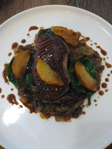 L'entrée, une rillette de cabillaud au poivre vert était délicieuse, j'ai adoré l'assaisonnement et la sauce au curcuma, pourtant je n'ai pas retrouvé l'artichaut promis sur le menu. Pour le plat, j'ai choisi un magret de canard que j'ai commandé rosé, accompagné d'une fondue d'oignon au miel, de pêches rôties et d'épinards, le plat était très réussi, mais j'ai été déçue d'avoir une cuisson trop cuite dans un établissement que je pensais irréprochable.