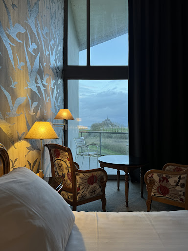 Read moreMy wife and I stayed at this hotel for one night in August 2023.|One notices a structure that was once supposed to be of a high standard.|The view from the room over Le Mont Saint Michel was very nice, although partially obstructed by some trees. Other rooms adjacent to ours had the view completely obstructed by these trees.|The rooms had no air conditioning.|The room was cosy, clean and tidy and the bathroom large and functional.|The balcony of the room, overlooking le mont saint michel, was large and equipped with two comfortable armchairs.|On our return from Le Mont Saint Michel, at 10.14 p.m. we went to the hotel bar, where there were two attendants, and asked for two beers, which we were denied by being told that service hours were over. We had to insist quite a bit with the manager and in the end, saying that we would take them to our room, we managed to get the two beers served: three minutes of discussion and about 1 minute to serve the two beers.|Breakfast the next morning was definitely not up to the standards of a hotel of this category: the scrambled egg and bacon containers only had a spoon for serving both (the classic tongs or, at most, a fork were missing), the result was a container of bacon soiled with scrambled egg (decidedly uninviting). Both coffee machines had run out of milk: impossible to serve a cappuccino. I pointed out the problem to the only attendant in the entire restaurant, but he was unable to add milk. Result, only coffee and no milk.|The view of Le Mont Saint Michel from the restaurant's windows would be breathtaking, were it not for the fact that the windows are not well cleaned and the effect is ruined.|The car park is ample, but beware that it is not lit at all and if you have to go to your car in the evening, you have to equip yourself with a phone torch because otherwise you will be in total darkness.|This is objectively...