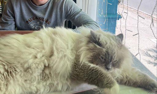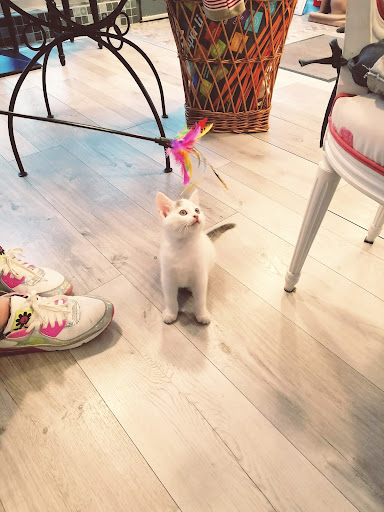 Read moreJ'aime découvrir des bar à chats et j'en ai l'habitude. Celui-ci est identifié sur Google comme tel. Pourtant à notre arrivée et ce pendant toute l'heure de notre goûter nous n'avons aperçu aucun chat et aucun aménagement pour ceux-ci, seulement un minuscule arbe à chats.