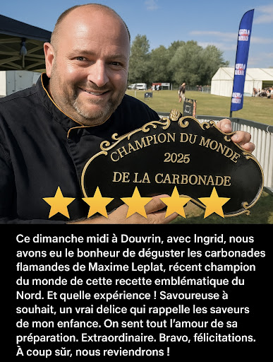 ⭐⭐⭐⭐⭐ Ce dimanche midi à Douvrin, avec Ingrid, nous avons eu le bonheur de déguster les carbonades flamandes de Maxime Leplat, récent champion du monde de cette recette emblématique du Nord. Et quelle expérience ! Hier soir, je suis allé chercher ces merveilles directement au distributeur qu’il vient de mettre en place en ce mois d’août, et dès la première bouchée… je suis resté sans voix. Subjugué, comblé, surpris, étonné : tous ces mots à la fois me sont venus en tête.