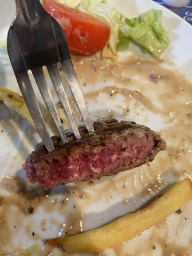 Read moreNous avons bien pris connaissance du mot écrit sur les sets de table à propos des mauvais commentaires. La direction estime que tous les mauvais commentaires sont écrits par des gens envieux ou jaloux, on a d’abord eu de l’empathie et le repas a révélé qu’il s’agit en réalité d’une mauvaise foi de la direction et un énorme manque de remise en question flagrant. Les entrées étaient correctes sans plus, présentation type cantine. Le pain pareil, très semblable à celui vendu à carrefour. Concernant les plats, je demande un steak cuisson à point, on me ramène un steak saignant voir bleu. À peine cuit avec encore de l’eau car steaks surgelés de mauvaise qualité. (Voir photo pour preuve). On oublie ma sauce au poivre, ça à la rigueur ça arrive, on me l’apporte, elle a un goût farineux horrible. À 2.80€ la sauce, c’est un peu abusé. Mon amie a pris une daurade à la provençale, généralement cela se cuisine avec de la tomate, elle avait juste un poisson posé dans l’assiette avec un riz blanc pauvre et sec. Aucune présentation, aucun assaisonnement, cuisine de cantine. C’est limite mensonger comme titre de plat sur une carte. On se dit qu’ils vont se rattraper sur le dessert: Mousse au chocolat opaque, amer, un goût de carton. On ne l’a même pas fini alors qu’on déteste le gaspillage alimentaire. D’ailleurs, je vais aux toilettes en attendant que les desserts arrivent, le serveur pose les desserts, il prend son TPE sans décrocher un mot et le met sous le nez de mon amie pour la forcer à payer. Il ne demande même pas comment elle compte régler (carte, espèce, séparé), juste il tend son TPE et repart. C’est moi qui était censé l’inviter, elle s’est senti obligé de régler. Depuis quand règle t’on alors que le repas n’est pas terminé ? Avant d’attaquer vos clients mécontents en prétextant de la jalousie, une remise en question serait envisageable, peut-être que vos produits sont frais ou de qualités mais si vous ne savez pas les cuisiner, ce sera mauvais. Votre cuisine est mauvaise et le service aussi. J’ai rarement été si barbouillé après un repas et aussi déçue surtout pour une addition pour deux à 61€.