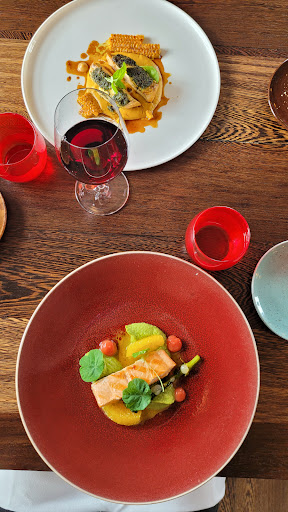 Récit d'une belle expérience ! Nous sommes allés déjeuner un dimanche en octobre 2024 avec ma fille au restaurant Côté Mas. Le lieu est très agréable, calme, lumineux, il faisait beau, le restaurant si situe au milieu des vignes et oliviers du domaine. La cave attenante permet à ceux qui le souhaitent d'acquérir les vins dégustés au cours de leur repas ce qui est fort intéressant. Nous avons déjeuner, ce qui n'a pas permis de profiter sans doute du spectacle du crépuscule qui au milieu de cette nature doit être un beau moment, mais la salle de restaurant est lumineuse et s'ouvre largement sur les environs grâce aux baies vitrées. Des terrasses extérieures permettent aux beaux jours de profiter de la nature environnante. La salle de restaurant est haute sous plafond, le bois domine, des tables sont en nombre raisonnable ce qui laisse de l'espace entre table pour une certaine "intimité". Nous avons été reçu chaleureusement par le chef de rang et comme nous étions les premiers nous avons pu choisir notre table. Peu de temps après avoir été installé, il nous a été proposé un apéritif (nous n'avons pris que de l'eau minérale...) et amené rapidement de la chiffonade d'un jambon de qualité accompagné d'un pain fait maison avec 2 choix d'huile d'olive du domaine. Nous n'avons pas un gros appétit et avons de ce fait choisi le menu du marché. Après avoir pris notre commande, le responsable des vins est venu nous proposer en fonction des plats choisis une sélection de vins de ses choix. Après avoir été servi d'une mise en bouche fraîche et pleine de saveurs, les entrées sont arrivées. Nous avions choisi de la daurade, accompagnée de betteraves et d'un condiment. Le produit en lui même (poisson) était très bon et grâce au condiment le goût de l'ensemble ne manquait pas de "tonicité".. Le vin blanc associé proposé était un cépage italien vermentino, léger, frais, avec un léger goût d'amande en fin de bouche, bien en accord avec le plat. Environ 10 minutes après avoir enlever nos assiettes et couverts, le plat principal nous été servi. Là encore il nous a été proposé plusieurs vins rouges, et après dégustation nous avons choisi un vin des terrasses du larzac avec en cépage un peu de mourvèdre, cépage que j'affectionne.... Le plat principal était pour moi des émincés de poulet accompagnées de maïs "travaillé" et d'une sauce crémeuse (dont j'ai oublié la nature exacte). Pour ma fille c'était du saumon accompagné de mousse broccolis et d'orange (voir photos des deux plats). Les plats étaient très joliment présentés et en fait savoureux aussi bien l'un que l'autre. Nous avons ressenti que les produits principaux étaient de très bonne qualité. Nous avons beaucoup apprécier ces deux plats aussi bien en qualité que quantité, et également au niveau visuel (couleurs). Est venu ensuite pour ma fille un pré-dessert, une "mini tartelette à base de crème caramel et de chocolat, suivi ensuite du dessert qui était une tarte avec pommes, chantilly, .. C'était le point faible du repas, ce dessert n'était pas à la hauteur du reste. Cependant il nous a été rapporté que la personne en charge des desserts état en congés ceci pouvant expliquer cela... En ce qui me concerne j'avais commandé une assiette de fromages afin de profiter du vin...et du bon pain accompagnant tout cela. Donc pour terminer une très belle expérience, que ce soit par le lieu, la qualité du service et de l'accueil, des saveurs des plats proposés et des vins associés qui sont un vrai atout pour ce restaurant. A voir si en jeunant un peu nous pourrions revenir pour le menu "Confiance" qui propose plus de plats. Comme écrivait Montaigne en son temps : "il faut courir le mauvais et se rassoir au bon", nul doute que nous reviendrons dans ce restaurant et le recommanderont à...
