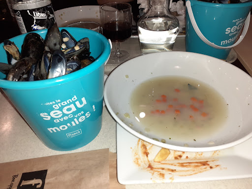 Je suis allée déguster, jeudi 27 Juillet un produit "phare "en été chez Flunch; "les moules à volonté" et je voudrais vous faire partager ce moment .J'ai choisi une entrée composée de plusieurs types de crudités. Les produits sont exposés à l' air libre et étaient assez secs pour certains. Les sauces, en bouteille, disponibles sur le bord sont sales et parfois collantes. J'ai également dû changer à plusieurs reprises de coupelles car plusieurs d'entr' elles présentaient des traces et salissures. Ensuite nous sommes passés en caisse avec mon mari et avons commandé les moules. Le personnel en caisse et en salle s'est révélé vraiment très agréable et dynamique, rien à redire. Quant aux accompagnements choisis( frites, ratatouille et pommes de terre grenade ) ils étaient assez bons et chauds. Je précise que les bacs étaient tout à fait corrects en terme de quantité. Concernant le plat de "résistance", les moules, et en particulier les moules "Marinière", c 'était un vrai régal!! nous en avons repris 2 fois et je vous recommande ce produit. Vos assiettes sont fournies avec un petit seau afin d'y déposer vos coquilles et la sauce était vraiment très réussie ainsi que la cuisson. Je dois cependant mettre un gros bémol à ma note car ces moules sont servies sans rince doigt; ce qui engendre des doigts collants et malodorants jusqu'au passage aux wc pour se laver . L'état des wc était juste correct et c 'est quand même dommage dans un endroit dit "familial". Quant aux tables certaines étaient vides mais pas nettoyées et collantes (pour la nôtre). Un merci également à Flunch pour la pâtisserie (industrielle certes ) au chocolat offerte à mon mari pour son anniversaire au gout classique et sympathique. Reste à parler du nerf de la guerre; le prix...qui est selon moi assez cher malgré tout. Voilà pourquoi je n ai attribué que la note de 3 étoiles à cet établissement. Alors si vous souhaitez gouter des moules sans le bruit de la mer mais avec pas mal de bruit ambiant quand même 😂mais des moules gouteuses...
