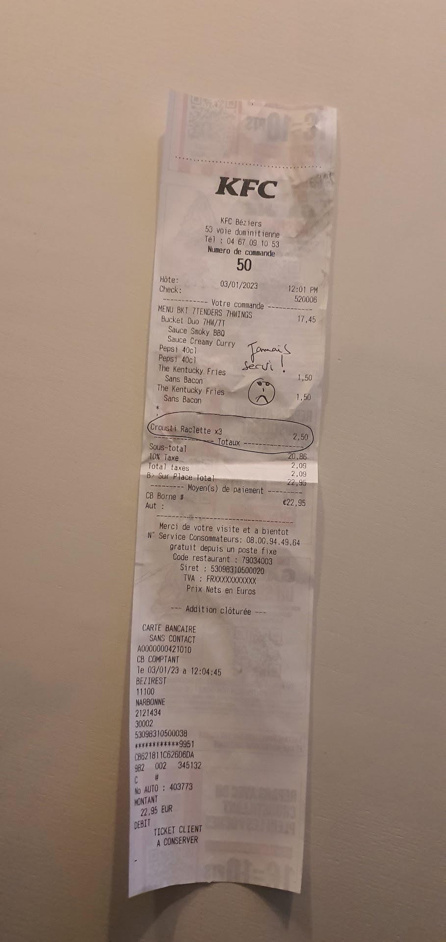 Je partage mon repas avec mon fils hier midi et il se commande en plus de son bucket duo des croustis Raclettes, 3 pour 2.50€ (quand même) Et bien ils auront été MANQUANTS SUR NOTRE PLATEAU ! c'est le constat que nous avons fait tous les 2 ce matin au petit déjeuner ! (Je suis retourné dans la voiture récupérer le ticket pour vérifier la commande...)