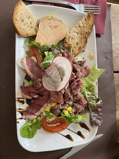 Delightful terrace shaded by trees in full leaf, trickle of a fountain giving a friendly, family feeling. Open kitchen, great seeing the chefs grilling food over an open fire. Menu choices were excellent, great selection beautifully plated. Set menu at 28.50€ was simple but a decent choice. Sadly, out of three main courses the meat (Taureau) was sold out at 1pm ! A replacement was offered. Unfortunately the service wasn't the best, we waited around 50 minutes between the starter and main course. Yo the restaurant's credit, they did apologise a number of times and we were offered a credit on our bill. Would I recommend this restaurant, absolutely, the personnel were great, jolly, and polite. The atmosphere on the terrace is really great, really worth the visit. Will we return,...