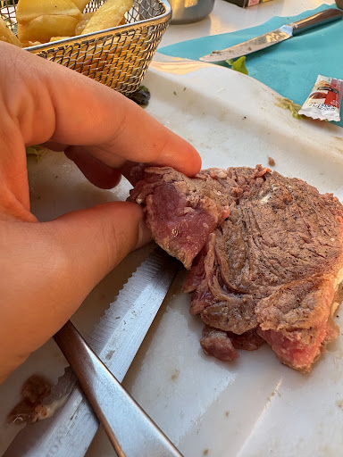 • L’entrecôte : demandée saignante mais servie dure comme une semelle. Plus d’os et de gras que de chair. Une sauce en supplément nous a été proposée, acceptée… (idem que pour les moules) nous la cherchons encore et quand même facturé.