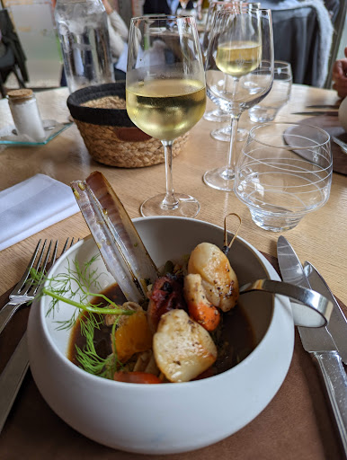 Read moreMalgré une situation perfectible le restaurant est une bonne adresse. La salle extérieure est pleine de verdure et très agréable, on oublie vite la zone "industrielle" à l'extérieur. Autrement, le service était irréprochable, les plats très biens. Et à un prix très honnêtes compte tenu de la prestation et du contenu des assiettes. J'aurais peut être apprécié un peu plus d'originalité dans les desserts (qui sont très biens, mais classiques). J'ai apprécié les plats, équilibrés sur les saveurs, quoique parfois avec une prédominance sucrée un peu trop prononcée à mon goût (exemple avec la compotée qui accompagne les grenouilles dont le sucre tend à rapidement prédominer sur l'ensemble même en n'en prenant peu). J'ai également apprécié le cocktail maison proposé en apéritif, rafraîchissant. Suggestion d'amélioration, les desserts doivent être commandé en début de repas. Mais ceux ci sont au dos de l'ardoise et ne sont donc découverts qu'au moment de la prise de commande, donc, en présence du serveur, qui attends votre choix. Cela conduit à devoir "presser la sélection" (à relativiser bien entendu) ce qui n'est pas le plus confortable. Je pense qu'il serait plus agréable que ces desserts soit visibles des le début avec l'ensemble...