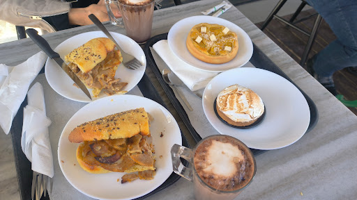 Great coffee, beautiful pastries, sandwiches, pizza slices. Cheerful staff. Very pleasant. But, the toilet had no toilet paper, no hand towels although the hand dryer did work. It needs a good clean, and a repaint on the door and walls. This should be checked regularly during opening times, a signed time sheet would ensure it was regularly checked and never short of products. Please remove the soap, attached to the wall for everyone to touch us not very hygienic nowadays. Once again, great selection of products and home...