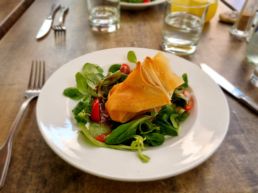 Our best meal in France! They have a lovely courtyard but it was too windy and cold today, so we went down to "la cave" which was cozy and filled with local families. Service was very friendly and quick, and the proprietor was happy to deal with our imperfect French. My wife had the pumpkin soup and I had the croustillant de St. Marcellin (crottin de chevre in filo pastry) as entrees, and both were lovely. She had the filet of pork and I had a risotto with scallops as our plats. All were perfectly cooked with great balance and subtle flavours. We plan to return before we...
