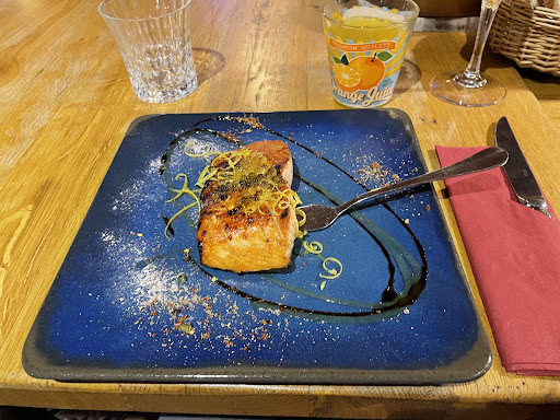Les grillades, spécialité de la maison, sont très attendues. Côté "Saumon" (citronné, fleur de sel) : rien d'exceptionnel. Ma propre cuisson à la poêle, à l'unilatérale, est toute aussi bonne. Pour accompagner : verre de blanc Jurançon sec "Grain Sauvage" 2020 (6€). Quant aux côtelettes d'agneau, tendres et fines à souhait, associées à la sauce au bleu, crée un ensemble divinement extra. La planche de légumes, à partager, présente des frites "maison" excellentes, un écrasé de pommes de terre et carottes étonnamment délicieux et une ratatouille honorable (légumes à la cuisson mieux maîtrisée).