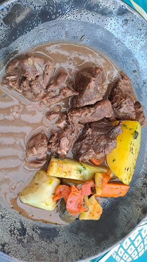 Plats commandés : 2 velouté de pois cassés, 2 boeuf bourguignon avec 2 bavarois framboise en dessert et 2 verres de vin rouge pour accompagner. 28,50€/personne c'est raisonnable. 5 étoiles c'est...