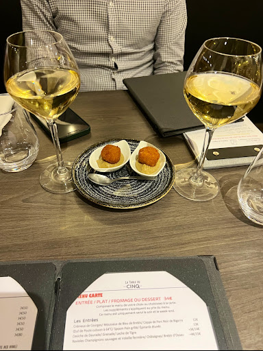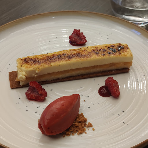 Tout simplement délicieux ! Du début à la fin, tout est raffiné, équilibré original, rien à redire Service au top, personnel particulièrement aimable et réactif et attention au détail (petits amuses gueule en patientant pour l'entrée, assiettes chaudes, couverts adaptés au plats, carafe reremplie sans avoir à demander) Cadre (nous avons mangé à l'intérieur) très agréable, décoration design et chaleureuse, chaises confortables (oui oui ça aussi ça fait plaisir)